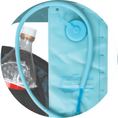 Hydration system with up to 3 liters of capacity; tasteless and antibacterial; hose passages left and right, IsoTubeTM neoprene-lined hose for heat or cold insulation; insulated storage compartment, can also be used for bottles or snacks.